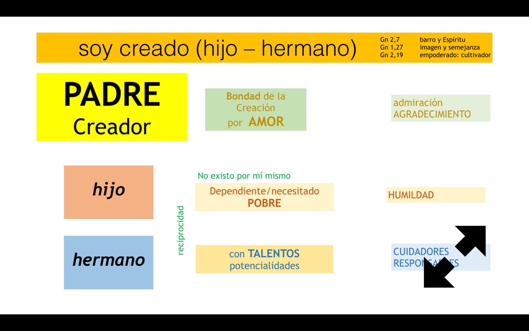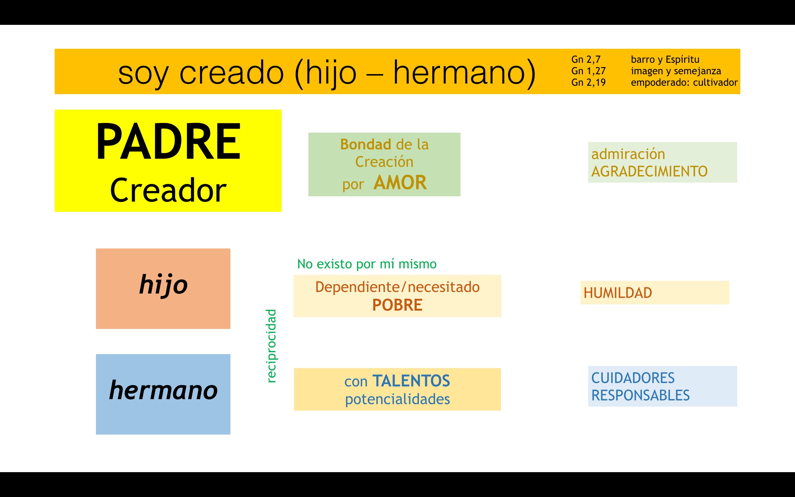 Padre creador / hijos y hermanos / creación por amor / admiración / gratitud / pobre, dependiente / con talentos, responsables, cuidadores -