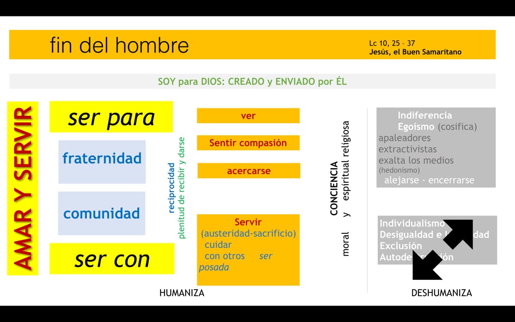 Recordamos que hemos sido creados para “amar a Dios en todas las cosas y a todas en Él” y que todas las cosas fueron creadas para el hombre, para que lo ayuden a alcanzar su fin: “alabar, hacer reverencia y servir a Dios Nuestro Señor” (San Ignacio). De ahí que sea esencial discernir el uso que hagamos de ellas. Ayudando a que sean lo que están llamadas a ser, siendo colaboradores de la acción de Dios en el mundo. La finalidad del hombre por tanto es la vocación de amar, de entregarse gratuitamente, haciendo el bien a los demás. En clave de Buen Samaritano, es ser conscientes del otro y poner la compasión en acción “con y para los demás”.