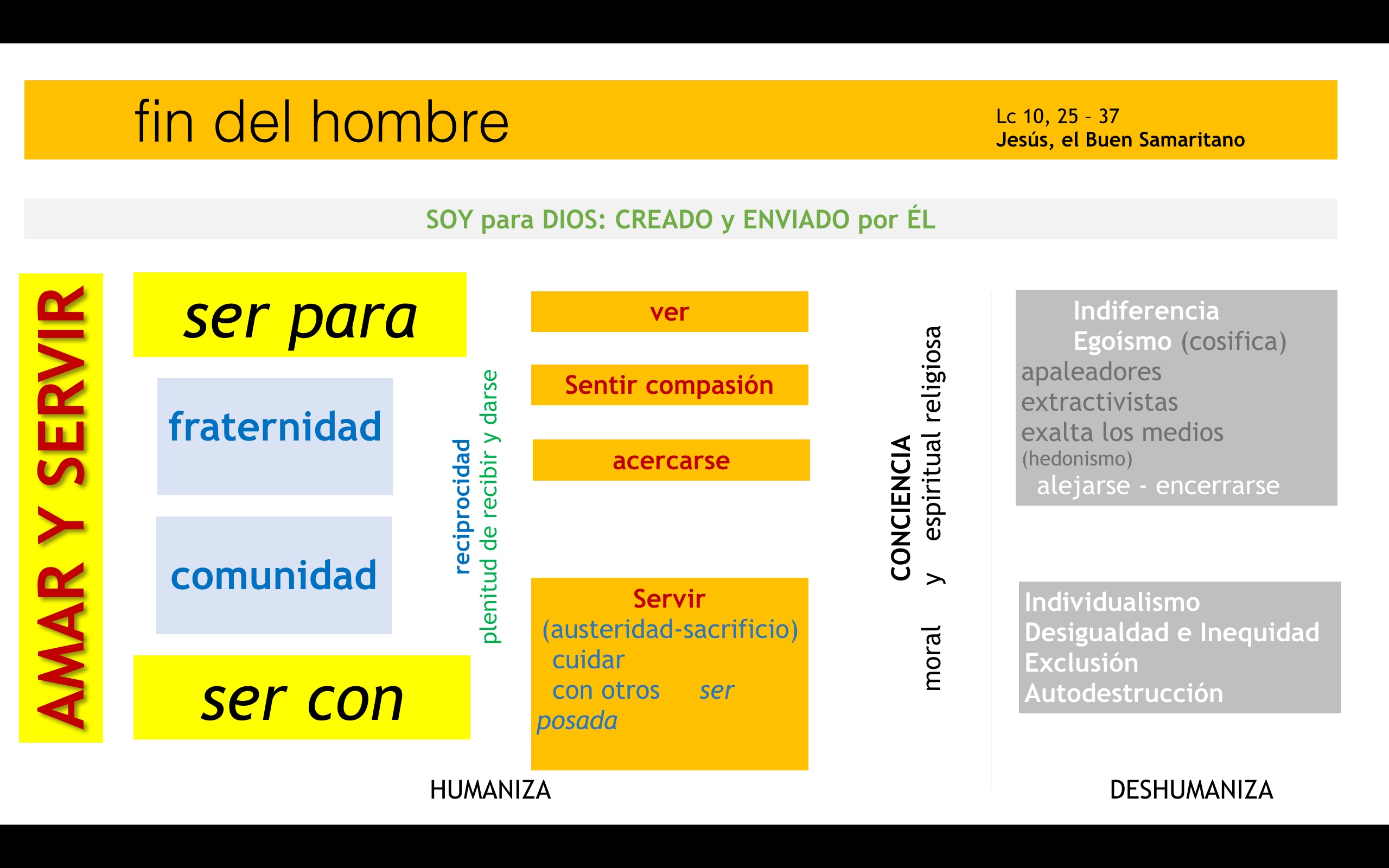 El amor que nos crea y hacia el que somos llamados, nos invita a salir de nosotros mismos, a reconocer el amor de Dios por todo lo creado, a disponernos y ofrecernos a los demás. Encontramos nuestro “para” caminando en comunidad, siendo solidarios unos con otros asumiendo el “servicio compasivo” del buen samaritano, frente a la indiferencia y el egoísmo, propio de los ladrones y de los que siguieron de largo.