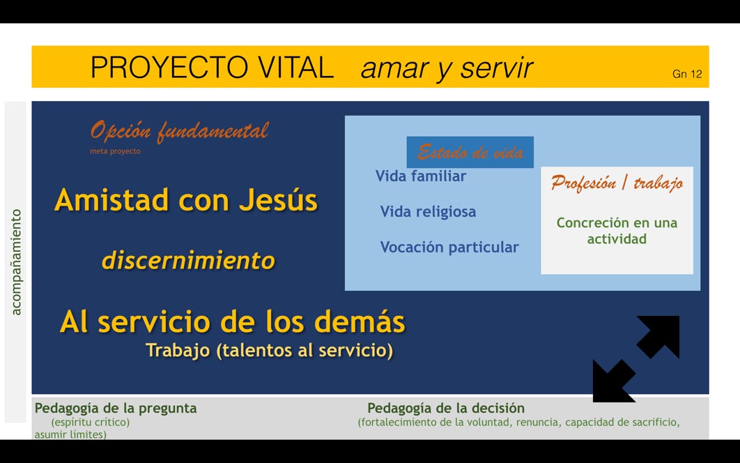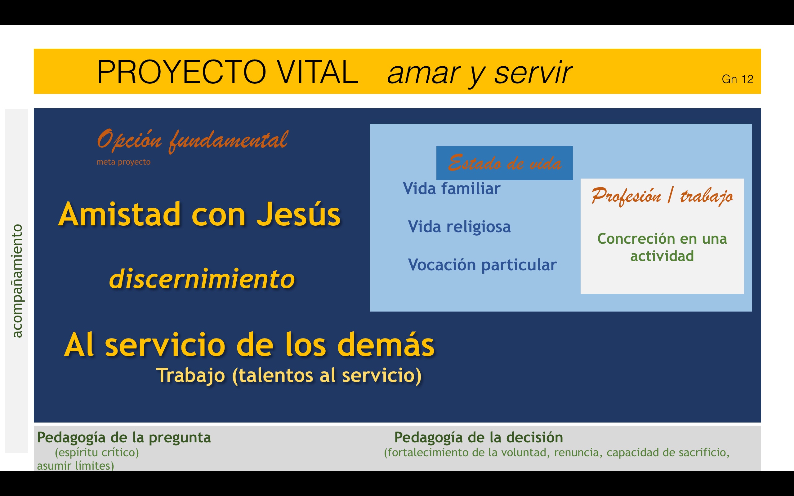 Al finalizar la etapa escolar secundaria, el proyecto vital no consiste en la planificación rígida y predeterminada de todas las acciones a futuro de la vida, aunque desde ya puede incluir proyectos concretos a corto, mediano y largo plazo. Se trata de un camino de opciones fundamentales que desde una mirada integral van llevando a la decisión de una relación con Dios en disponibilidad amorosa y a la entrega a los demás en el servicio. El discernimiento es la herramienta fundamental para ir dando los pasos que configuran el proyecto vital, haciéndose las preguntas existenciales profundas. Algunos pasos serán parte de decisiones existenciales que comprometen más radicalmente el futuro al ser trascendentes (como la concreción de un estado de vida; matrimonial, vida religiosa y otro tipo de vida consagrada). Otros serán tentativos y cambiantes como una profesión, un trabajo, un proyecto. En este marco hay orientaciones existenciales que no son negociables: la aceptación de la vida que es vocación al amor, amor que se concreta en la amistad con el Señor y el servicio al prójimo.