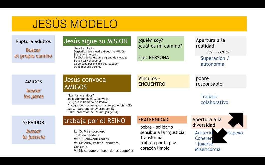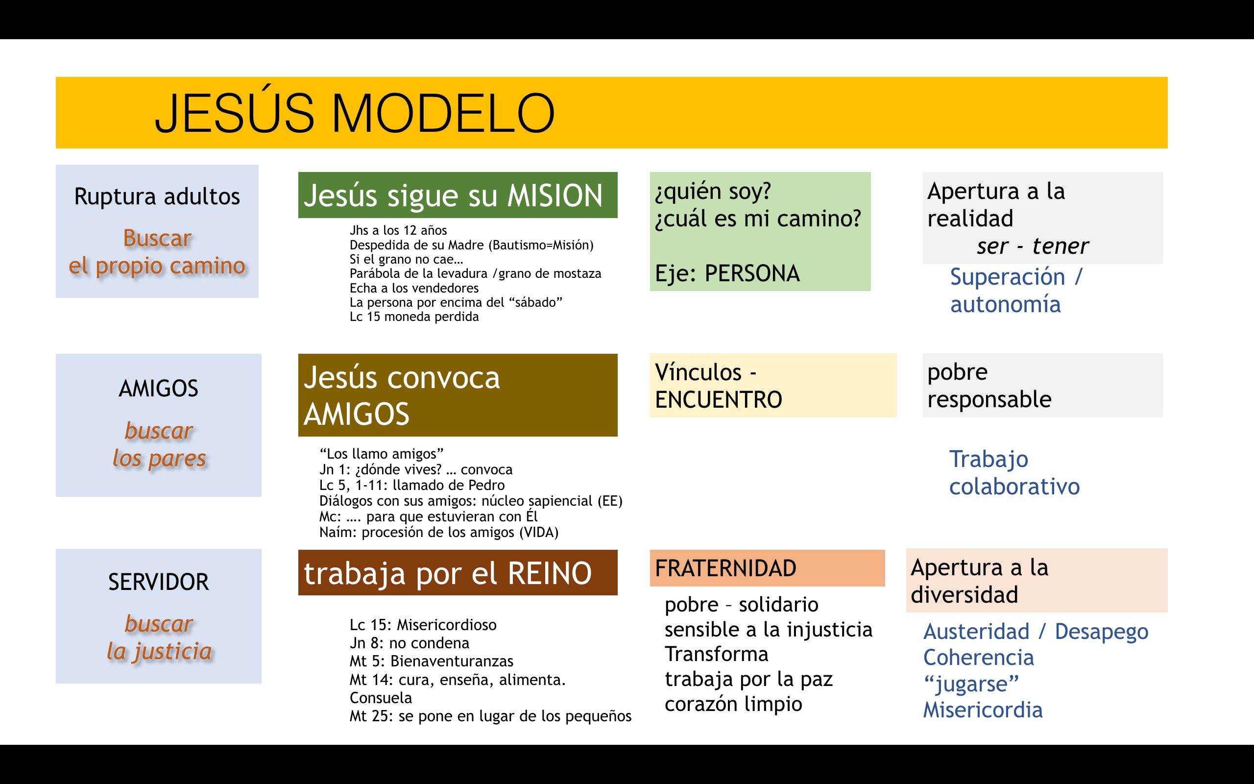 En efecto, Jesús es el modelo en las cuatro etapas: somos creados a Imagen de Dios en Cristo (etapa 1), Él es el Dios que se abajó y tomó la condición de esclavo, se puso a servirnos “hasta el extremo” (etapa 2). Su alimento es hacer la voluntad del Padre, esta misión es la que configura su proyecto de Vida y su Pascua (etapa 4). Vemos entonces a Jesús como la medida de lo humano y en Quien este Itinerario encuentra su origen y su finalidad. Como dice el Papa Francisco en Christus Vivit “Jesús es joven entre los jóvenes para ser ejemplo de los jóvenes y consagrarlos al Señor. Porque la juventud es una etapa original y estimulante de la vida que el propio Jesús vivió, santificándola” (22).
